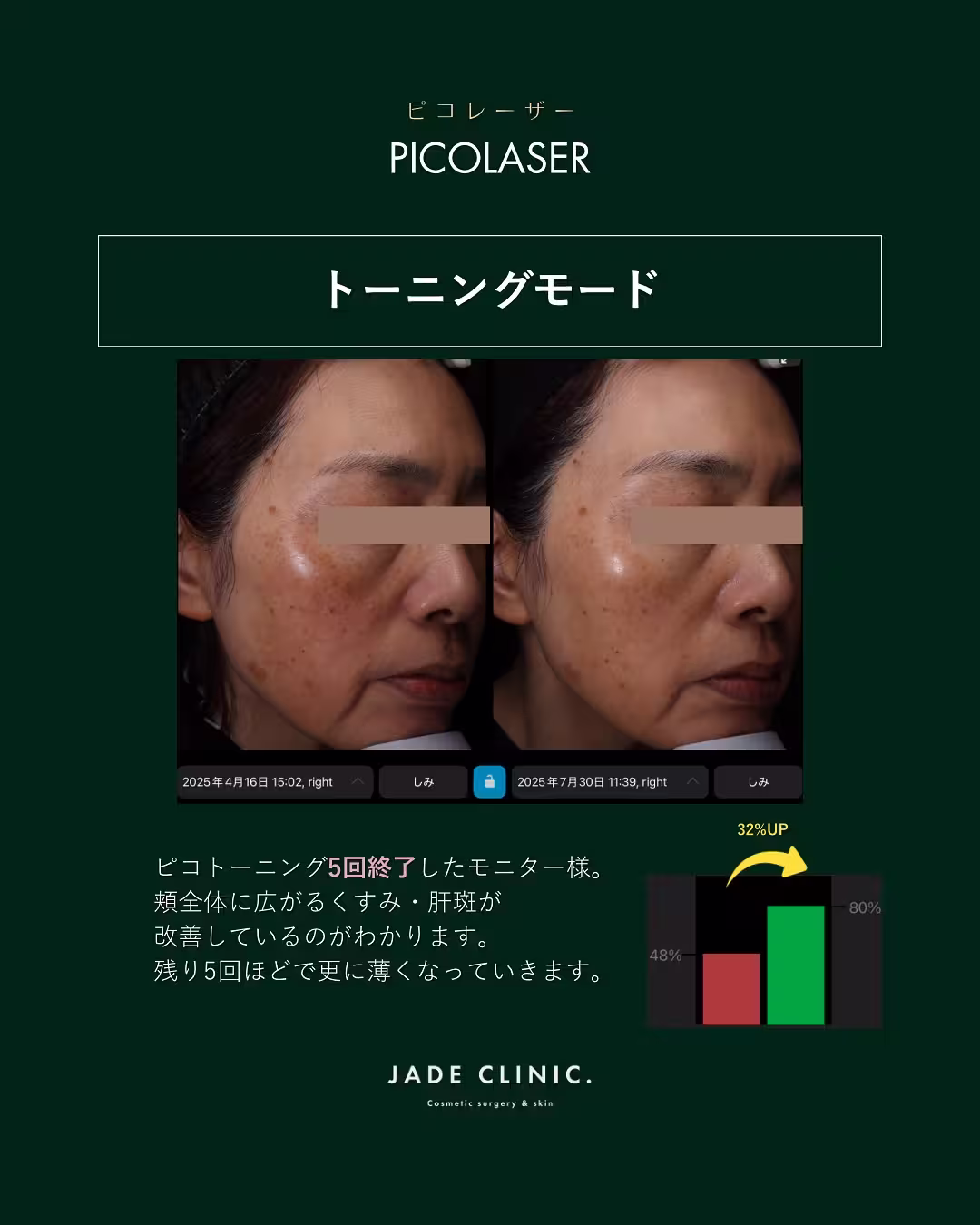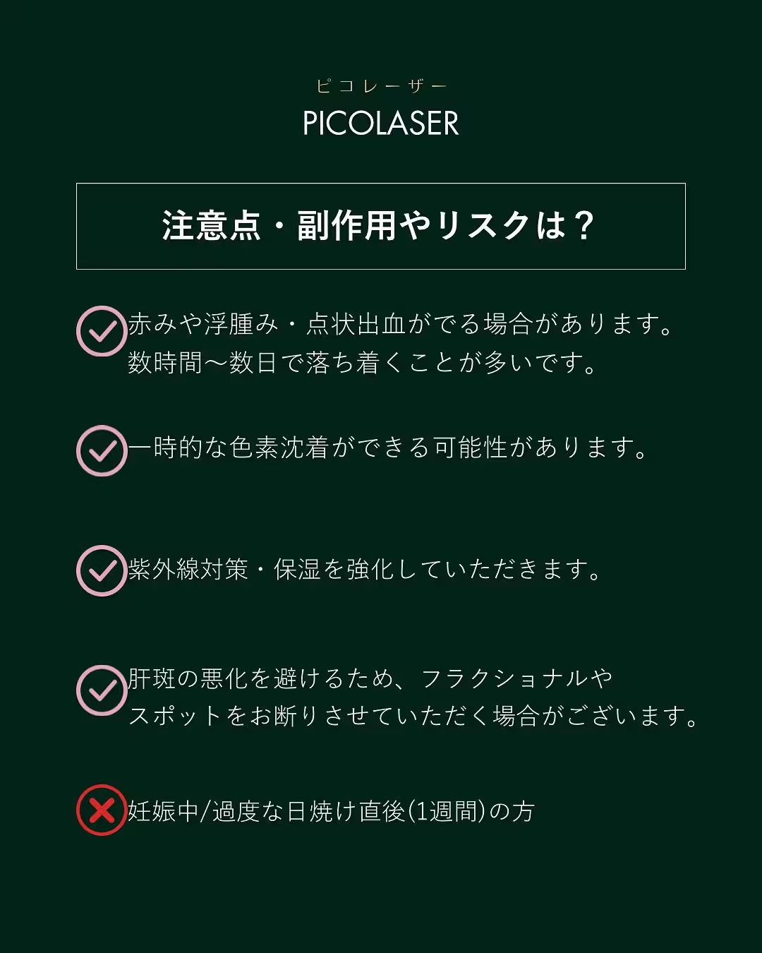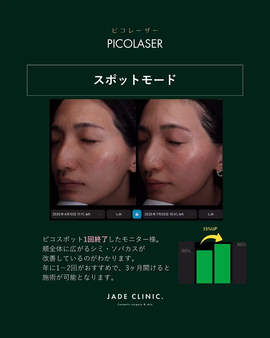 シミにスポット照射したあとに起こりやすい“炎症後色素沈着(PIH)”が、他のピコレーザーに比べて少ないのが特徴です。治療後に色が濃くなる心配が少なく、継続して通いやすいのも嬉しいポイント🌿