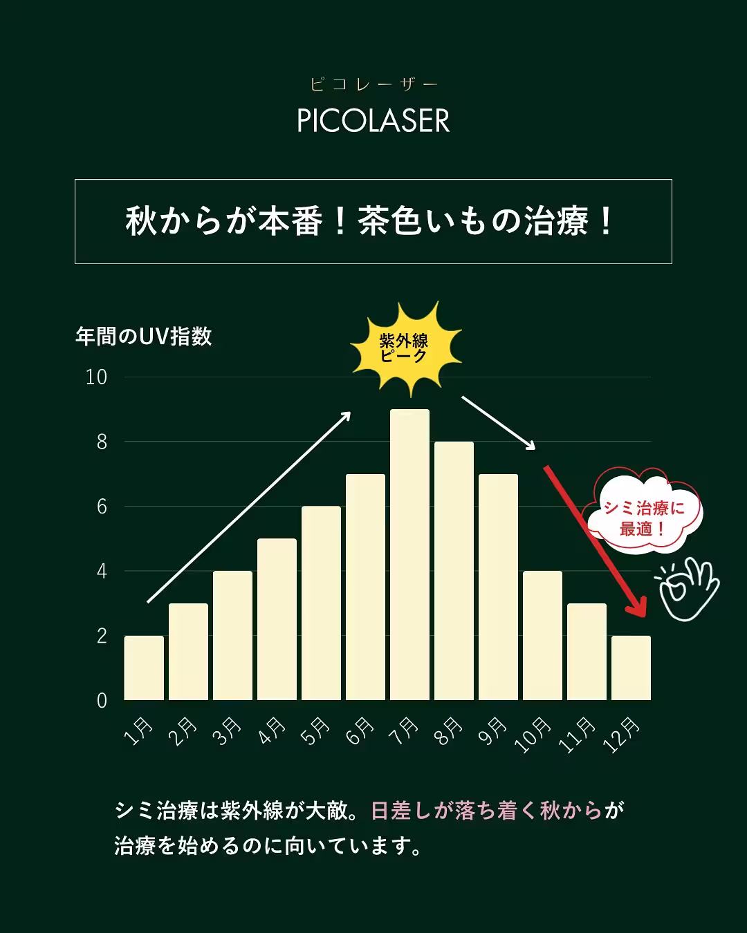 紫外線量を示す「UVインデックス」は夏がピークで、8月は福岡でも平均7〜8と高め。ところが9月に入ると一気に下がり、平均5前後に🍂。秋は紫外線対策がしやすく、レーザー後のデリケートなお肌を守りやすい環境なのです。